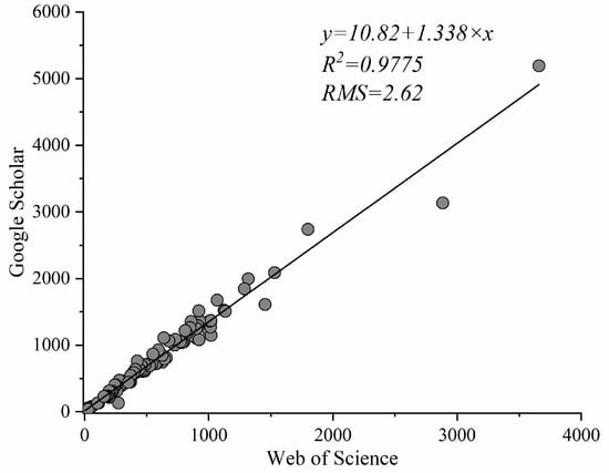 In addition, we used Google Scholar to verify the accuracy of citations in the database (Web of Science) used in this paper. The scope of the Web of Science core collection is limited, mainly to SCI, SSCI, ESCI, and other source journals/conference papers with high authority. Google Scholar includes not only the Web of Science but also EI searches, preprint websites (such as ArXiv, SSRN, etc.), and papers such as university/scholar personal websites. Web of Science and Google Scholar calculate the citations of a paper based on how many papers in their databases cite it. We obtained a total of 100 articles with citations of different orders of magnitude from Google Scholar and compared the data with the Web of Science used in this paper. Figure 15 shows the fitted curve, correlation coefficient, and goodness-of-fit for these 100 samples. The goodness-of-fit degree is greater than 0.9, indicating that the straight line fits the sample values well. The correlation coefficient is 0.9775, and there is a strong correlation between the citations in the two databases. This verifies the reliability of the results of this study to a certain extent.
