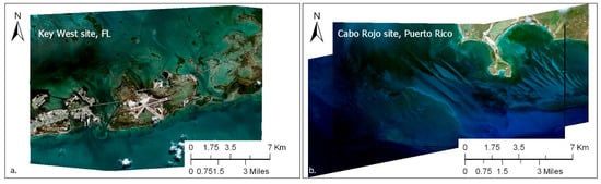 WorldView-2 stereo imagery for Key West, Florida (a), and WorldView-3 imagery for Cabo Rojo, Puerto Rico (b). The WorldView imagery was acquired from the Maxar archive through USGS Earth Explorer [83].