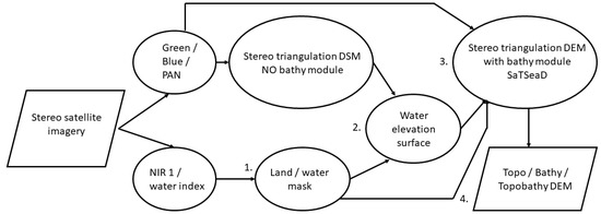 The SatSeaD module consists of the following general steps (Figure 5): 1. Land/water mask; 2. Water elevation surface calculation; 3. Stereo triangulation with bathymetry module; 4. Topo/Bathy/Topo-bathymetric 3D point clouds and DSM.