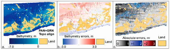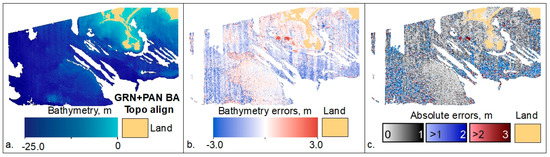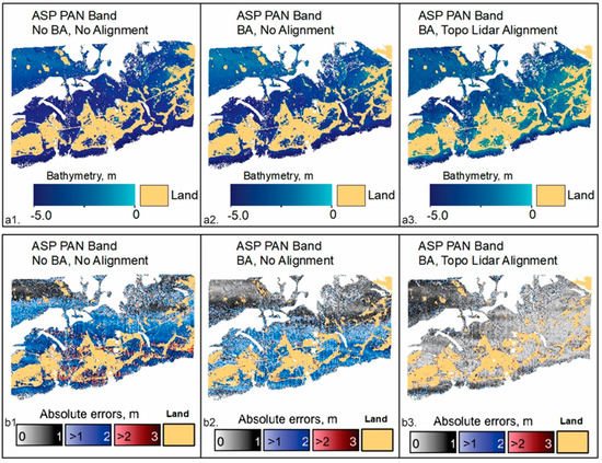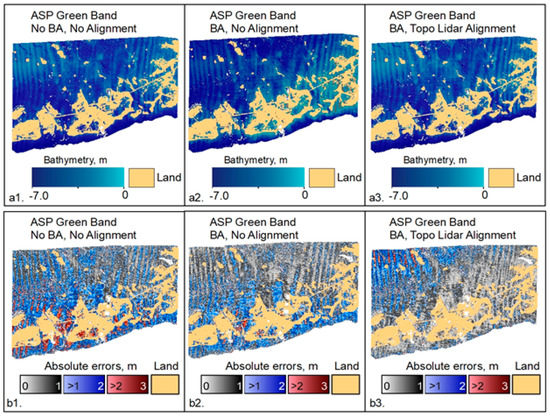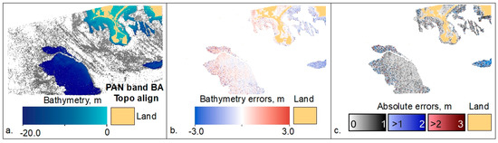 In the methodology description above (Section 2.3.1), bundle adjustment (BA) [99] was not used with either MS or PAN bands. Theoretically, BA should increase the accuracy of the camera positions and their attitudes and thus increase the accuracy of the TBDEM result. Bundle adjustment can be used in ASP with only topography, as well as TBDEM reconstructions, but caution is needed to make sure that all data are consistent, from water/land mask generation and water plane level definition to the stereo reconstruction itself.