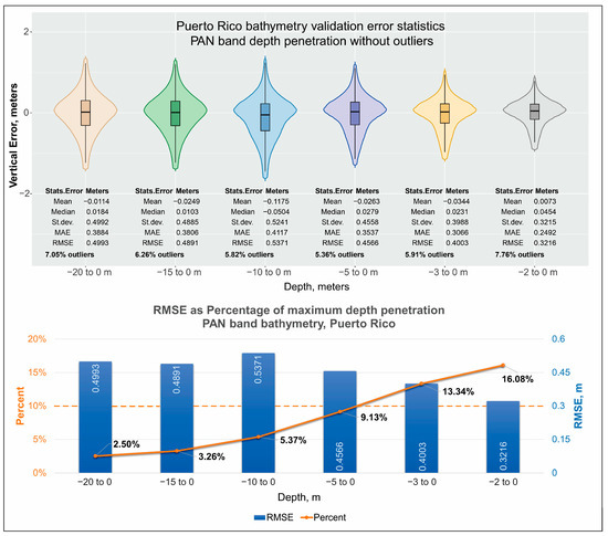 The ASP bathymetry module can take advantage of the higher resolution and accuracy stereo PAN data to derive TBDEM, but it is at the expense of smaller depth penetration for bathymetry since PAN imagery spectral response is skewed towards the red and NIR bands, limiting its water depth penetrating ability. On the other hand, the increased accuracy of TBDEM from PAN data is sufficient for using only the PAN data up to its maximum depth penetration for locations where these data exist and completing it with deeper bathymetric results from the green or blue bands.