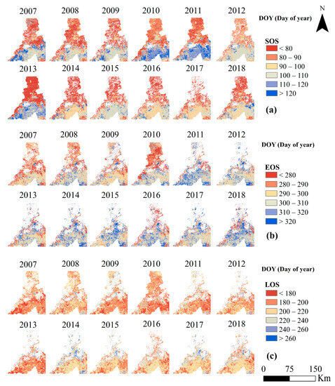 Spatial distributions of (a) SOS, (b) EOS, and (c) LOS in the study area from 2007–2018; the default values are caused by the elimination of effects such as clouds or by outliers of phenological parameters that do not exist within the defined threshold conditions.