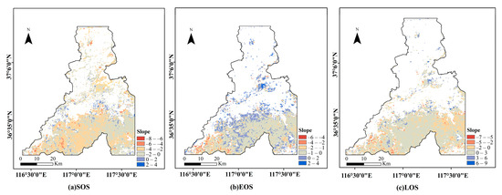 Spatial distribution of interannual trends in (a) SOS, (b) EOS, and (c) LOS in the study area from 2007–2018; the default values are caused by the elimination of effects such as clouds or by outliers of phenological parameters that do not exist within the defined threshold conditions.
