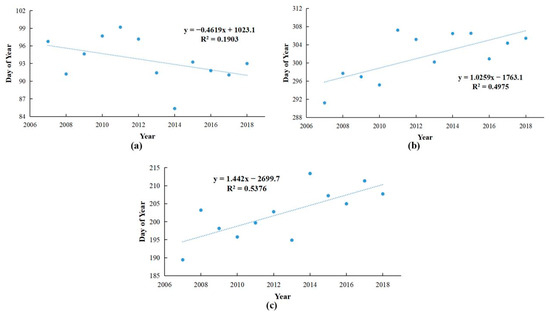 Interannual variation of (a) SOS, (b) EOS, and (c) LOS in the study area from 2007–2018. (The blue dots correspond to the mean value of a certain year’s phenological indicator, and the blue lines represent the linear regression line of these dots).