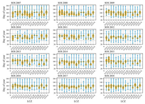 Violin plot of the SOS distribution based on different LCZs from 2007 to 2018. The shape of the yellow area reflects the density distribution of the data; the top line shows the maximum, the center line shows the average, and the bottom line shows the minimum.