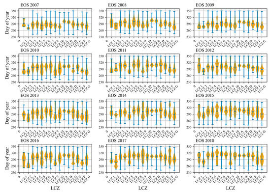 Violin plot of the EOS distribution based on different LCZs from 2007 to 2018. The shape of the yellow area reflects the density distribution of the data; the top line shows the maximum, the center line shows the average, and the bottom line shows the minimum.