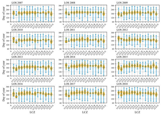 Violin plot of the LOS distribution based on different LCZs from 2007 to 2018. The shape of the yellow area reflects the density distribution of the data; the top line shows the maximum, the center line shows the average, and the bottom line shows the minimum.