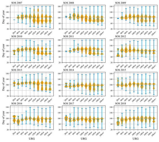 Violin plot of the SOS distribution based on different URGs from 2007 to 2018. The shape of the yellow area reflects the density distribution of the data; the top line shows the maximum, the center line shows the average, and the bottom line shows the minimum.
