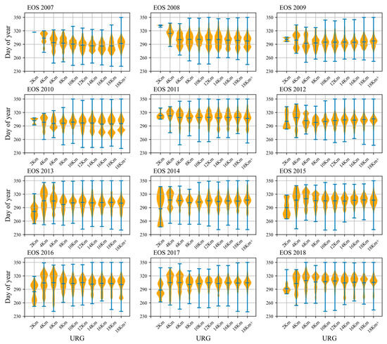 Violin plot of the EOS distribution based on different URGs from 2007 to 2018. The shape of the yellow area reflects the density distribution of the data; the top line shows the maximum, the center line shows the average, and the bottom line shows the minimum.