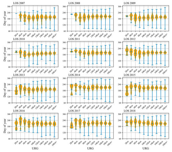 The distribution of vegetation phenology on different URGs was not widely varied. This might be related to each having a different LCZ type on the gradient (Figure 8d). The SOS mean values fluctuated slightly across the different gradients during the study period, which was all around 100 days. The SOS mean values on 2 km were generally low (Figure 9). The earliest SOS averages were usually found in 2 km or 4 km. For EOS, the mean values on 2 km were generally higher, which was most evident from 2007–2011 (Figure 10). Since 2012, the maximum EOS mean began to appear on 4 km or 6 km. Starting from 4 km, as the gradient increased the EOS mean fluctuated less, and was mostly distributed around 300 days. In general, starting from the urban center, the SOS showed a gradual delay with increasing gradient, while the EOS was gradually advanced (Figure 9 and Figure 10). The distribution of LOS along URGs was similar to that of EOS (Figure 11). The urban center area had a long LOS, and the landscape composition and configuration affected the spatial pattern of vegetation [18]. As in the suburbs in the northern part of Jinan, most EOS and LOS values were distributed around 297 and 200 days in 2016, respectively.