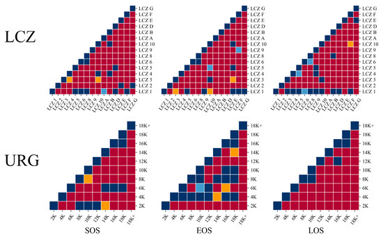 HSD test results of SOS, EOS, and LOS based on LCZ and URG in 2016. Dark blue represents no significant difference, while red, orange, and light blue represent significant differences with significance levels of 0.001, 0.01, and 0.05, respectively).