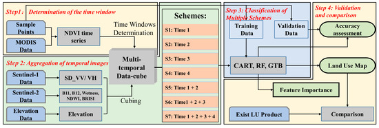 Step 3: Classification of Multiple Schemes: Based on the seven aggregated multi-temporal images, three commonly used classification algorithms (CART, RF, and GTB) are used to perform the classification task (Section 3.3), and a total of 21 classification scenarios are generated.
