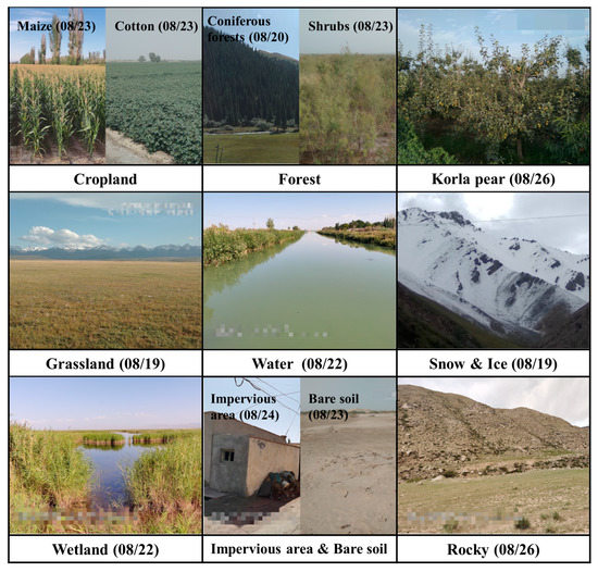 For this study, we collected 538 ground truth sample points of land use (i.e., GPS points, accuracy: ±1 m) during the field survey in the study area in August 2021. The sample points were mainly concentrated near roads and were used to define land-use classes. The photos of the reference GPS points were taken near roads. However, because the study area is relatively large and some areas are inaccessible, for safety reasons, we supplemented 989 sample points via manual visual interpretation using the Google Earth software. Therefore, the total number of sample points in this study is 1527, which includes nine classes: cropland, forest, Kolar pear, grassland, water, snow and ice, wetland, impervious area and bare soil, and rocky terrain. Section 3.1 describes these categories in detail, and the number of sample points in each category is shown in Table 1. A total of 70% of the random sample was used for training, while the remaining 30% was used for validation.