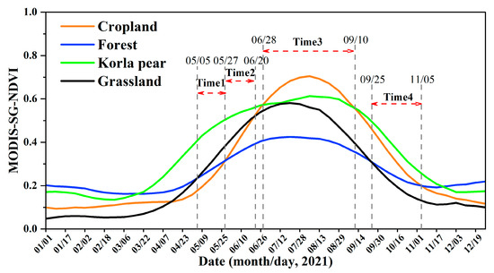 MODIS-SG-NDVI time series curve for different vegetation types (cropland, forest, Korla pear, and grassland) in the study area in 2021. The curves provide the mean NDVI values of the sample points.