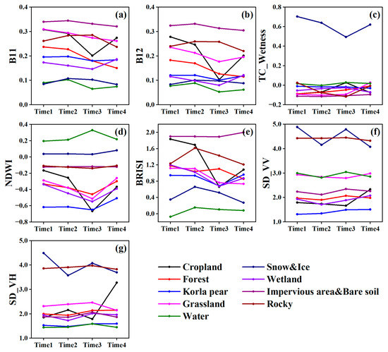 Time-series variation of different spectral properties for each class. (a–g) Time-series variation curves for different land use categories for B11, B12, TC_Wetness, NDWI, BRISI, SD_VV and SD_VH features, respectively.