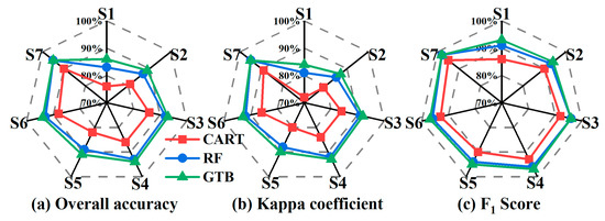 (2) In each scheme, the GTB classifier outperformed RF, which, in turn, outperformed CART. The average accuracy of GTB for all schemes exceeded 90% (presenting OA, kappa, and GTB are 92%, 91% and 96%, respectively). The average OA, kappa, and F1 scores for RF for all the schemes were 90%, 89%, and 95%, respectively. The CART classifier performed the worst, with OA and kappa values below 90%, and the average OA, kappa, and F1 scores were 84%, 82%, and 91%, respectively. Differences are evident in the accuracy increase for the three models: the GTB model provides greater accuracy than the RF model, with an increase from 0–3% in terms of OA and kappa. The percentage increase is more significant when compared with that of the CART model (5–10% increase in OA, 6–12% increase in kappa, and 3–7% increase in F1 score). Compared with the CART model, the RF model yielded a 5–7% increase in OA, a 6–9% increase in kappa, and a 3–5% increase in F1 score. These results show that the difference in accuracy between the integrated classifiers (GTB and RF) based on decision trees is more significant than that between the integrated classifiers and the base classifiers.