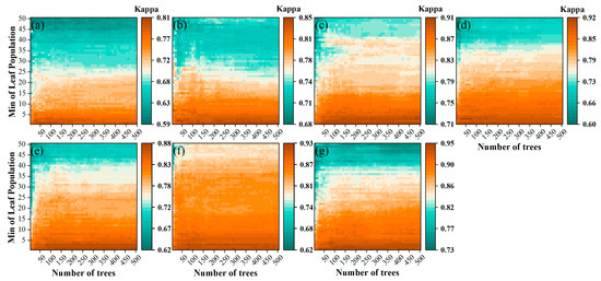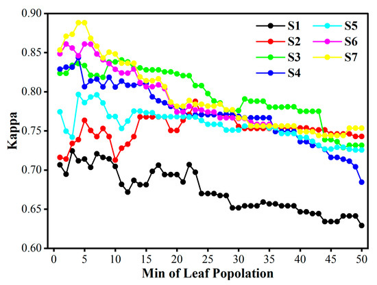 Figure 8 shows that the RF model is sensitive to the parameters, with the difference in the kappa value varying from 20% to 32% across all schemes. Thus, the min of leaf population parameter more significantly affects the model than the tree number parameter because the accuracy changes dramatically upon increasing the minimum leaf tree parameter, whereas the accuracy changes very slightly upon increasing the tree number parameter. In this case, the optimal parameter for the minimum leaf population is 1 in all schemes in this study except for Scheme 6 (optimal min of leaf population is 3), whereas the optimal parameters of the trees in different experiments vary widely (the optimal parameters of S1 to S7 are 50, 90, 270, 110, 80, 470, and 250, respectively).