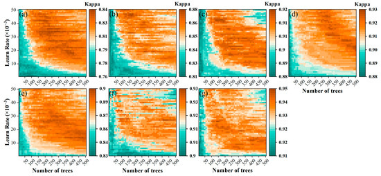 Figure 9 shows that the sensitivity of the GTB model to the parameters is relatively low, with no variation in kappa exceeding 10% in all schemes. When both parameters are low (i.e., a tree less than 100 or a learning rate less than 0.01), the other parameter has less of an impact on the model, with only a slight change in kappa. On the contrary (i.e., a tree greater than 100 or a learning rate greater than 0.01), the accuracy changes substantially upon varying the other parameter. For the tree parameters, GTB and RF are similar in that the optimal tree parameters vary significantly across schemes (those of S1 to S7 are 240, 270, 500, 440, 480, 410, and 140, respectively), and the number of trees is always greater than 100. The differences in the optimal learning rates across multiple schemes are relatively small (those of S1 to S7 are 0.027, 0.019, 0.015, 0.027, 0.014, 0.027, and 0.026, respectively), with a variation of less than 1%.