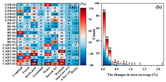 Land-use maps of all the scenarios were prepared, and all the results can be seen in Figure S1 of the Supplementary Materials. Most of the maps replicate the general landscape features, but there are spatial differences in certain categories. Specifically, the S2-CART scenario erroneously identified some agricultural fields in the eastern part and some grasslands in the western part as wetlands (Figure S1(C1)). There are significant spatial variations in the distribution of water bodies in the southeast corner of the study area, most notably with respect to Figure S1(G3) generated using S6-GTB.