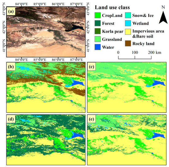 The study area is located in the Xinjiang Uygur Autonomous Region, north of Bayingoleng Mongol Autonomous Region, and covers an area of 150,440 km2, as shown in Figure 1. This study area was selected because its landscape features are prevalent in the entirety of Xinjiang, making our findings relevant to a region larger than the study area (but still within Xinjiang). The study area is located in an area with arid and semi-arid subregions with diverse ecosystem types and various patterns of land use. Within this area, bare soil and rocks are frequently found in the central and southern parts of the study area, which constitutes the largest percentage of area. The next largest area, that of green vegetation, mainly includes forests and grasslands in the north, and cultivated crops, such as wheat, maize, cotton, vegetables, and fruit trees, in the central part of the study area. The harvesting of the Kolar pear is one of the local specialty industries that promotes the local economy, but the existing land-use products are incomplete in their portrayal of the areas in which this pear is grown [9]. There are also bodies of water (rivers and lakes), cities, permanent snow and ice in the north, and wetlands; however, existing products underestimate the acreage of wetlands. Furthermore, the ecosystems in the region are also fragile [40]. Climate change and the drive to improve local productivity have caused local land-use changes and ecological degradation [41]. For example, despite the lack of water resources, agriculture remains the primary economic sector and is responsible for the conversion of other land types (such as shrubland or even forest land) into agricultural land to increase yields and for the conversion of agricultural land into plantations to increase economic efficiency. At the same time, irrigation has caused ecological problems such as groundwater reduction, the degradation of the ecological functions of local rivers and lakes, a reduction in forested area, and the degradation of grassland [42]. Thus, this region lacks a reliable, well-targeted, and more accurate land-use product. The average elevation of the study area is 1640 m (772–4801 m) (data source: NASADEM), and the climate is moderate- and warm-temperate continental, which is mainly characterized by aridity and low rainfall, with an average annual precipitation over 100 mm, a high rate of evaporation, long sunshine hours, and an average annual temperature of 11.8 °C. The topography of the study area is complex, with high mountain areas coexisting with plains; the high mountain areas have spring and autumn seasons with no summer, whereas the plains have four distinct seasons.