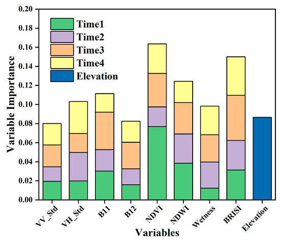 Figure 14 shows the importance of the feature variables in Scheme 7. The total score of each feature variable varies somewhat, with a maximum score of 16% (NDVI) and a minimum score of 8% (VV_Std/B12), which indicates that the features contribute differently to the model. The NDVI is the most important feature of the model, which is exemplified by the fact that five classes related to vegetation (cropland, forest, Kolar pear, grassland, and wetlands dominated by grass) were identified in this work. Notably, the highest importance score of 8% for the NDVI occurred at Time1. Elevation plays a role in classification, presenting an importance score of 9%, which is due to the wide north–south topographic variation in the study area, where almost all grasslands are on the plateau, whereas poplars in the forest appear mainly near the desert at lower elevations. Figure 10 also shows the importance scores for all features at different times, with total scores of 25% for Time1, 19% for Time2, 25% for Time3, and 22% for Time4. This result indicates that the characteristics of Time1 and Time3 are relatively important for classification in Scheme 7.