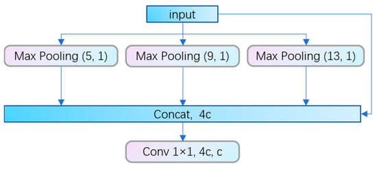 The network structure of YOLO v7-Tiny is shown in Figure 6, which consists of three parts: backbone, neck, and head. Backbone consists of two Conv 3 × 3 operators, three Max Pooling operators, and four ELAN (Efficient Layer Aggregation Network) blocks, in which Conv 3 × 3 operators and Max Pooling operators are responsible for down-sampling and ELAN blocks are responsible for feature extraction. The input with the size of 1024 × 1024 is down-sampled by 8, 16, and 32 times to obtain feature maps with sizes of 128 × 128, 64 × 64, and 32 × 32, respectively. ELAN is an improved block based on VoVNet (Variety of View Network) [40] and CSPNet (Cross Stage Partial Network) [41], which optimizes the gradient length of the overall network. VoVNet is a concatenation-based model that preserves the information of intermediate feature layers by aggregating different receptive field feature layers while considering the efficiency of the network. Its speed and accuracy performance are better than previous plain structures and residual structures. CSPNet believes that the problem of high inference complexity is caused by the repetition of gradient information in network optimization. Therefore, the CSP module is used to first divide the feature mapping of the basic layer into two parts, and then merge them through a cross-stage hierarchical structure, reducing computational complexity while ensuring accuracy. ELAN retains the idea of VoVNet aggregating different receptive field feature layers, while also considering the inference calculation problem caused by repeated gradient information. The left two routes in Figure 7 reflect the concept of CSP (Cross Stage Partial), while the overall four routes reflect the concept of concatenation based, preserving the information of the middle layer. The neck of YOLO v7-Tiny adopts a classic PAN (Path Aggregation Network) structure [42], which consists of a top-down FPN (Feature Pyramid Network) [43] structure and a bottom-up FPN structure. The first FPN communicates the semantic information of the upper layer by concatenating the up-sampling results of the upper layer with the lower layer, while the second FPN concatenates the down-sampling results of the lower layer with the upper layer to convey the positioning information of the lower layer. The feature fusion of PAN effectively improves the effectiveness of the network. The internal blocks of the neck include an SPP block [44] and four ELAN blocks. The SPP block is shown in Figure 8. By executing Max Pooling with different kernels on the input, the feature maps of different receptive fields are obtained, and then these feature maps are concatenated to achieve multi-scale feature fusion. The head of YOLO v7-Tiny has three outputs, corresponding with sizes of 128 × 128 × 60, 64 × 64 × 60, and 32 × 32 × 60, 60 indicates that each location of the output feature map has three predicted boxes, each predicted box includes 15 categories, 4 coordinates, and 1 score.