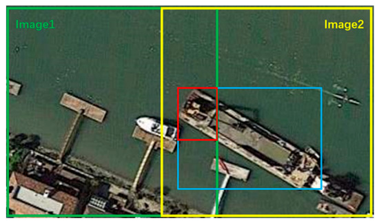 The predicted box filtering in remote sensing images splicing. The red box indicates the predicted box in image1. The blue box is the predicted box in image2.