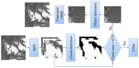 Figure 10 illustrates the process of on-board multi-class geospatial object detection. The steps involved are as follows: (1) Image Slicing: The input large image is divided into 1024 × 1024 tiles. (2) Cloud Detection: Cloud detection is performed on each tile, generating binary cloud detection images. If the cloud area exceeds 75% of the entire tile, the tile is considered a cloud image and filtered out. The process then moves on to the next tile. If the cloud area is below the threshold, the tile is considered to contain valid information and proceeds to the next step. (3) Object Detection: Object detection is performed on the retained tiles, aiming to detect and classify various objects of interest within the tile. (4) Truncated NMS: Truncated NMS is applied to the object detection results. This step filters out duplicate detection boxes and incomplete boxes caused by image slicing. The coordinates of the remaining detection boxes are mapped back to the input image.