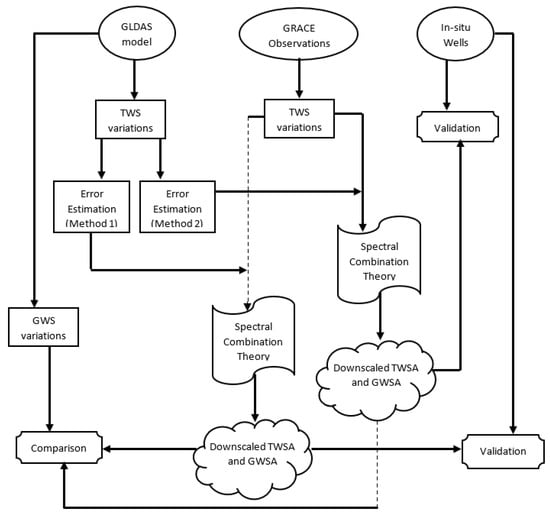 It must be noted that the GWSA from GLDAS model are not included in the process of spectral combination. We will see in the following sub-section that by proposing two methods of GLDAS errors, two different downscaled results of GRACE-based TWS/GWS will be extracted (reference to the provided flowchart in Figure 1). Therefore, showing the variations in GWS derived from GLDAS is only to understand which downscaled GRACE GWS are similar to the GWS derived from GLDAS.