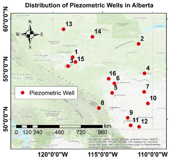 In addition to GRACE and GLDAS data, we used in situ measurements to validate the results that were obtained following the application of the approach. For instance, 16 active unconfined piezometric wells were used to validate our downscaled GRACE GWS anomalies. Validation was limited to the province of Alberta, based upon the wells that were available. Figure 2 shows the locations of the piezometric wells over the topographic map of Alberta. As the figure shows, there are 16 wells over the area and their distribution is denser in the south-east and the north-west over flat areas and close to residents.