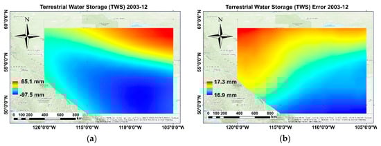 (a) Terrestrial water storage (TWS) and (b) TWS error computed from the GRACE model in December 2003 over the Alberta province.