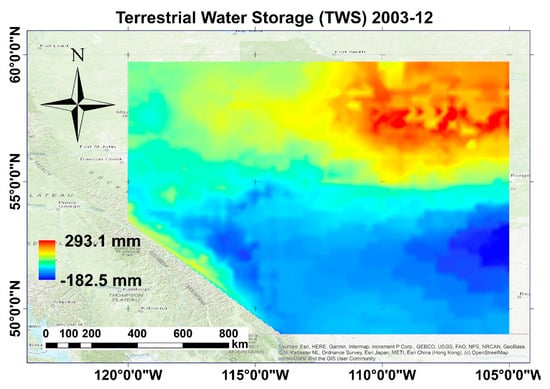 Average value of terrestrial water storage (TWS) of the GLDAS daily models in December 2003 over the Alberta province.