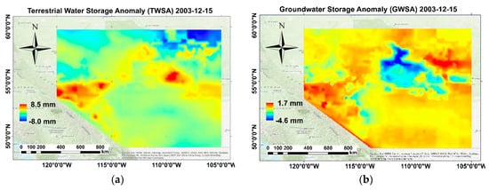 (a) Terrestrial water storage anomaly (TWSA) and (b) groundwater storage anomaly (GWSA) of the GLDAS model on 15 December 2003 in Alberta.