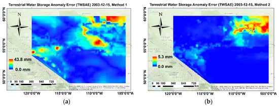 (a) estimated uncertainty for the GLDAS TWSA in Alberta on 15 December 2003 using (a) Method 1 and (b) Method 2.