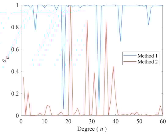 Estimated spectral coefficient for the estimator (Equation (30)) when the error spectral of the GLDAS TWSA on 15 December 2003 is computed using Method 1 (the blue line) and Method 2 (the red line).