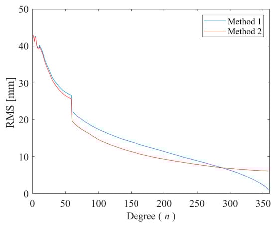 Figure 10 presents a graph depicting the changes in the mean squared error (MSE) of the estimator (Equation (27)) as the degree of combination increases. According to the least-squares principle, it is expected that the MSE will decrease with increasing data, in this case, the signal frequencies. The plot in Figure 10 shows a decreasing trend, except for very low degrees. This can be attributed to the limited amount of data over the oceans in the GLDAS model. Nevertheless, the estimator displays an RMS of approximately 10 mm when considered up to degree 360. As expected, our new method for uncertainty estimation, Method 2, leads to a smaller RMS for the spectral downscaling estimator than Method 1. The MSE is smaller for degrees higher than degree 300 when using Method 1 for downscaling, but this result was anticipated, considering that the estimated uncertainty spectra of the TWS exhibit greater independence when Method 1 is employed, in contrast to the case when Method 2 is used. The incorporation of the magnitude of hydrological parameters in Method 2 for estimating uncertainties restricts the uncertainty spectra from decaying rapidly.