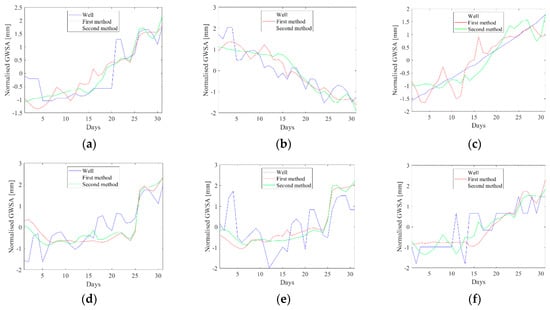 In order to show the behaviour of the time series of the changes in a meaningful way, we have normalised the GWSA of wells and the interpolated downscaled one by subtracting their respective mean values and dividing the result to their standard deviations. In other words, we have standardised them for better visualisation. Some of these time series have been shown in Figure 12. Generally, the estimated GRACE GWSA have good agreements with those of the wells. Figure 12a–f are, respectively, the time series of variation in GWSA at wells number 1, 3, 6, 13, 14, and 15. We observe the significance of a proper uncertainty estimation strategy for the GLDAS hydrological parameters in spectral downscaling of GRACE models for estimating GWSA. As all these time series show, the variations in the GWSA where Method 2 was used for uncertainty estimation are closer to those of the wells than Method 1.
