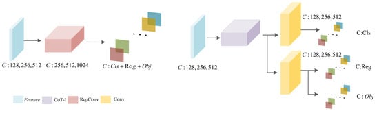Our DCTI structure starts with features obtained after the backbone, FPN, and PAN stages. X has three different dimensions of features; (H, W, and C) are (20, 20, 128), (40, 40, 256), and (80, 80, 512), respectively. For the purpose of enhancing the lucidity of the presentation, we solely exemplify the variations in channel C, as depicted in Figure 3. The coupled detection head depicted (left) leverages 1 × 1 convolutions and the RepConv module to enhance feature information along the channel dimension. Despite its simplicity, this approach is remarkably effective. However, in the context of object detection tasks, it becomes evident that the classification task primarily emphasizes salient feature information, while the regression task is more concerned with capturing boundary feature information related to the targets. Employing a shared Repconv module for both tasks inevitably introduces conflicts between them.
