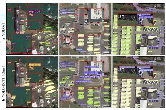 Recognition results in crowded environments of Dota-small dataset. (a) Recognition results of the YOLOv7 network. (b) Recognition results of the YOLO-DCTI network.