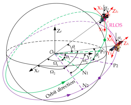 The space targets orbit can be determined by the six orbital elements deriving from a given two-line element (TLE). It can be expressed as (semi-major axis), (inclination), (right ascension of the ascending node), (eccentricity), (argument of perigee), and (true anomaly) [34,35,36]. Thereafter, the accurate RLOS can be obtained by calculating the real-time position of space-based radar in the RTN coordinate system of the space target. The derivation of RLOS is as follows: