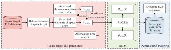 - Finally, the RLOS, azimuth angle and elevation angle are calculated aswhere represents the RLOS in the space target RTN coordinate system at the k-th sample interval. and are the azimuth angle and elevation angle of the , respectively. can be utilized to calculate and to realize the dynamic RCS sequence mapping.