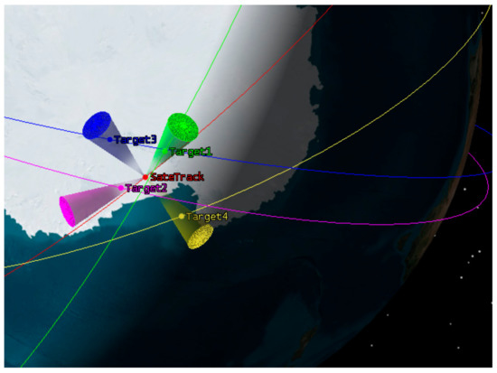 In the given simulation scenario, Figure 5 represents a typical multi-target tracking scenario with four space targets within the surveillance region. The space-based satellite in this scenario utilizes a C-MIMO radar system to track these four space targets. The TLE (two-line element) information [37] for the selected four space targets is depicted in Table 2. Table 3 displays the six orbital elements of the space-based radar, and Table 4 provides the radar system parameters in detail.