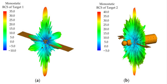 In this section, the monostatic static RCS database of the space targets is calculated using electromagnetic computing software, and the simulation results are depicted in Figure 6a–d. To obtain the RLOS parameter sequences in practical applications, different methods can be employed. Here, we determine the position of satellite targets using TLE and calculate their relative position to the radar station using the SGP4 (simplified general perturbations 4) model through aerospace orbit calculation software. The RLOS parameters can then be computed using Equation (29). Finally, the dynamic RCS sequence results can be obtained by combining the static full-angle RCS and the RLOS parameters.