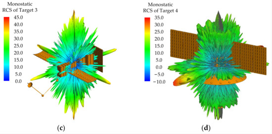 Monostatic RCS of four typical space targets (azimuth degree varies from 0° to 360°, elevation degree is fixed at 90°).