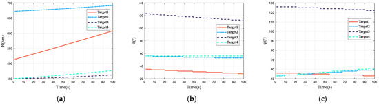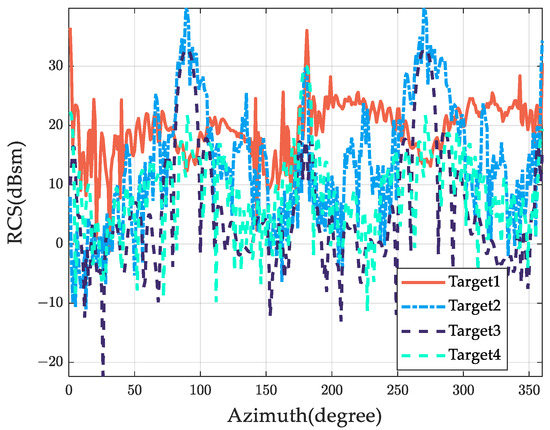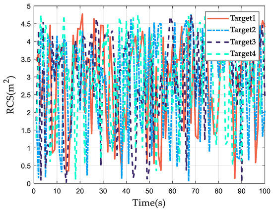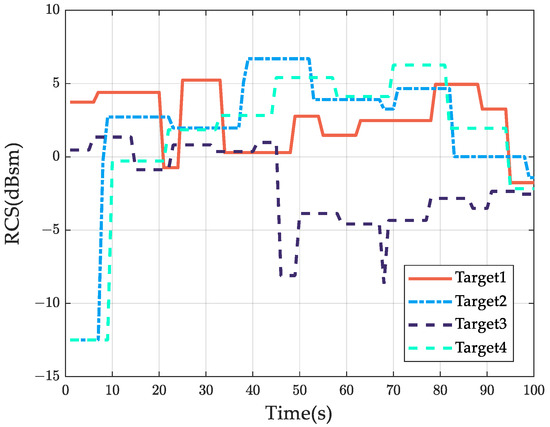 Notice that from Figure 9 it can be observed that the dynamic RCS of different targets varies to a significant degree. The dynamic RCS of target 1 and target 2 fluctuates in a large dynamic range, while target 3 generally has the smallest RCS among the four targets. In addition, the dynamic RCS of target 1, target 2, and target 4 overlapped with each other. Therefore, the real-time dynamic RCS results can be effectively utilized to enhance the accuracy of multi-target tracking.