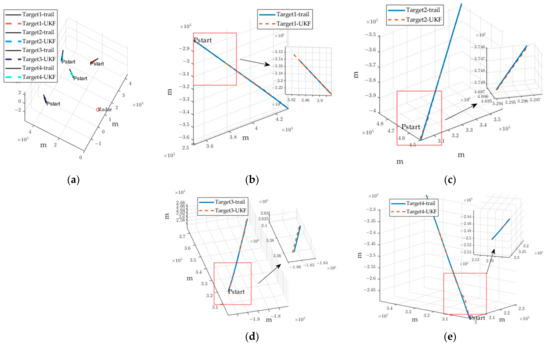 Figure 10a gives the multi-target tracking result of the space targets monitored by the space-based radar. As can be seen from Figure 10b–e, the C-MIMO radar achieves multiple target tracking with simultaneous multi-beam mode. The image indicated by the arrow in Figure 10 b–e is a zoomed-in view of the region inside the red box.