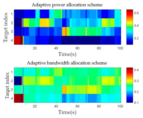 The Min-Max PCRLB criterion is employed in this paper to dynamically allocate the power and bandwidth resource of the space-based radar. The core idea of the Min-Max PCRLB criterion is to optimize the target with the worst tracking accuracy. By solving Equation (30), the proposed method calculates the joint allocation result of power and bandwidth, as shown in Figure 11.