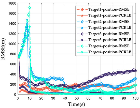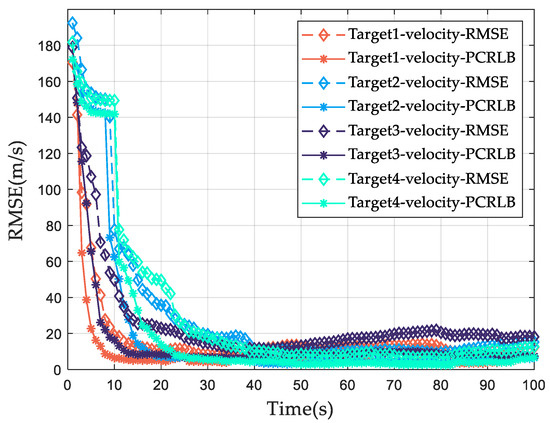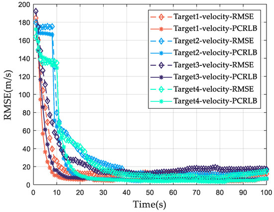 Figure 12 and Figure 13 depict the RMSE curves and PCRLB of position and velocity of 100 Monte Carlo experiments during the whole tracking scenario. It can be seen from Figure 12 and Figure 13 that both the ideal PCRLB for position tracking accuracy and the ideal PCRLB for velocity tracking accuracy experience a significant decrease starting from the tenth frame. Considering that the Min-Max PCRLB criterion is utilized for multi-target joint power bandwidth allocation, the PCRLB of position and the PCRLB of velocity for four space targets have the same tendency. Since the Min-Max PCRLB criterion is employed for the multi-target joint power band-width allocation, the PCRLBs for position and velocity of all four space targets exhibit a similar trend.