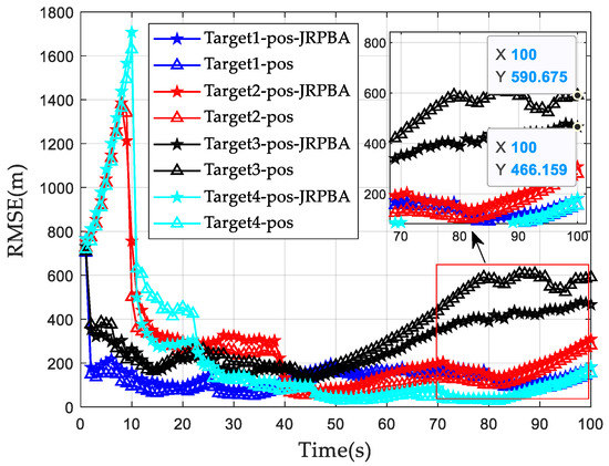 In the simulation experiments, the UKF (unscented Kalman filter) recursion is employed for tracking space targets using one hundred frames of radar raw data [38], with a data update rate of 1 s and 100 Monte Carlo trails. To provide a more intuitive comparison of multi-target tracking performance and tracking accuracy, the root mean square error (RMSE) of location and velocity are utilized and presented in this section.