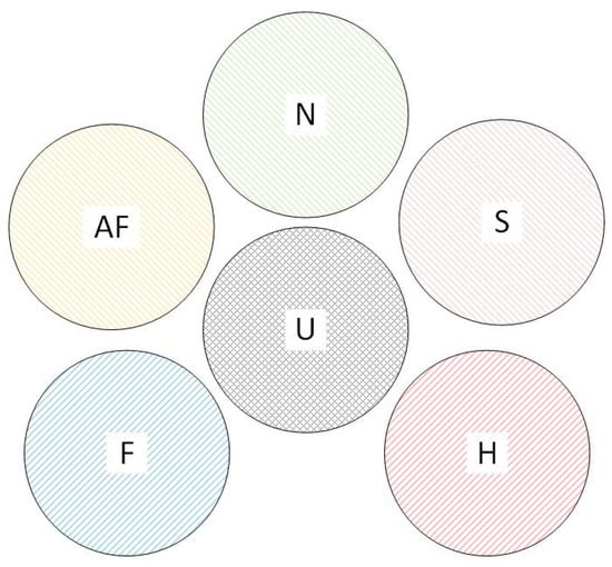 At this point, it should be noted that DSmT is not the only development of Dempster–Shafer theory. DSmT provides different rules for the proportional redistribution of the conflict mass between the resulting BBA masses in the process of information fusion. Examples of this development of Dempster–Shafer theory can be found in [,,]. In [,], it was proposed to use the negation evidence (BBAs from sensors) and Deng’s [] entropy to determine BBAs after information fusion. The new BBA distribution is calculated as a weighted sum of the original BBA, with the weights being a function of Deng’s entropy. The paper [] shows the application of the negation evidence method in fault diagnosis.